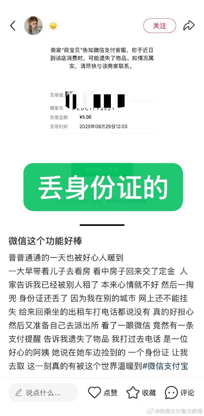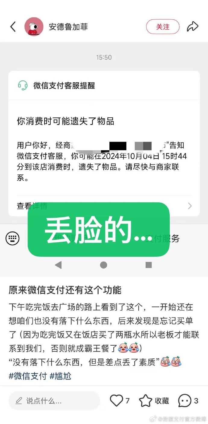 近日,微博话题#第一次知道微信支付还有这功能#登上热搜。如果你使用微信支付付款,如果丢东西了,商家可以通过微信的客服提醒你。