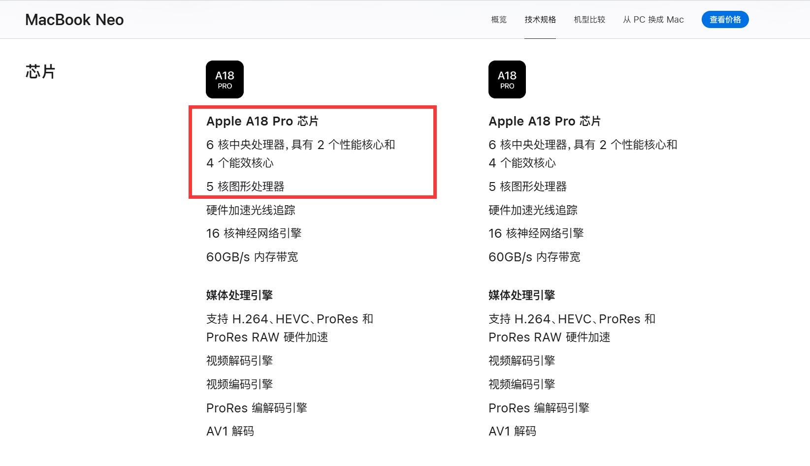 值得注意的是,在具体的图形处理规格上,两款设备存在细微差异。MacBook Neo所采用的A18 Pro芯片集成了5核图形处理器(GPU),而iPhone 16 Pro搭载的版本则拥有6核GPU,比笔记本版本多出一个核心。