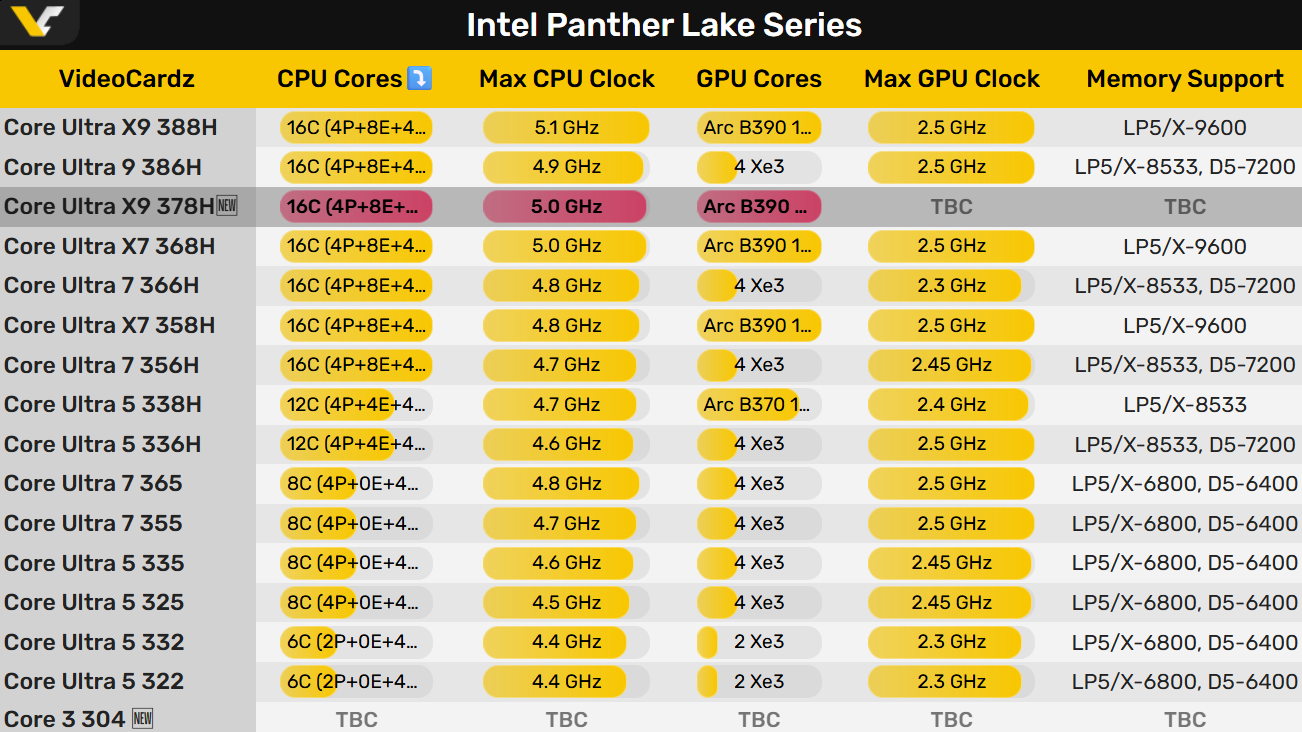 Intel Panther Lake家族的酷睿Ultra 300H系列笔记本即将陆续上市,而根据路线图,Intel又准备了一款新型号:“酷睿Ultra X9 378H”。具体规格目前只知道几个主要参数,但看起来和酷睿Ultra X7 368H似乎一模一样: