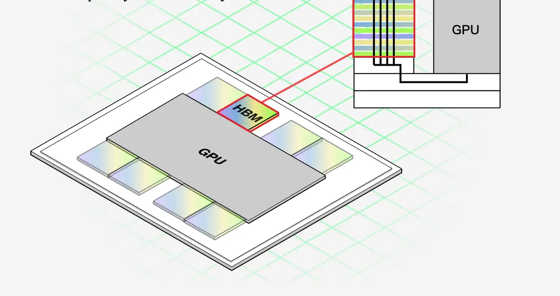 AI的兴起催生了DRAM芯片的全新封装方式:高带宽内存(HBM)。该技术通过垂直堆叠多层内存颗粒(即存储数据的独立硅片),并将其紧邻处理器放置,相较传统内存可大幅提升数据传输速度。
