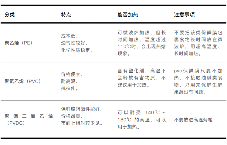 市面上常见的食品级保鲜膜材质主要有聚乙烯(PE)、聚氯乙烯(PVC)、聚偏二氯乙烯(PVDC)和其他生物降解材料。我们总结了材质特点和使用注意事项↓