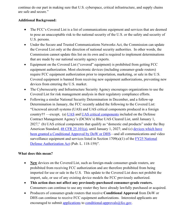 FCC表示,该决定包含豁免条款,经国防部或国土安全部评估不构成上述不可接受风险后获得“有条件批准”的路由器不在限制范围内。