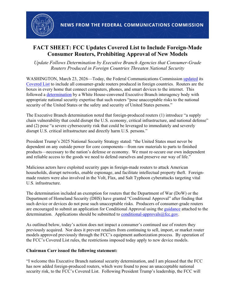 美国联邦通信委员会(FCC)在声明中表示,禁止进口所有外国制造的消费级路由器,因为认定此类路由器“对美国的国家安全或美国人员的安全与保障构成不可接受的风险”。