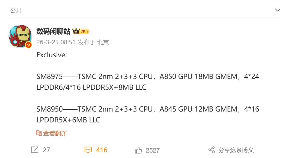 高通计划在今年9月正式发布骁龙8E6系列旗舰平台。此次高通将同步推出骁龙8E6和骁龙8E6 Pro两款顶级芯片,并由全新的小米18系列全球首发。根据博主曝光的参数规格,这两颗芯片均基于台积电最先进的2纳米工艺制造。这标志着小米手机将正式迈入2纳米时代,在芯片能效比上实现跨代飞跃。