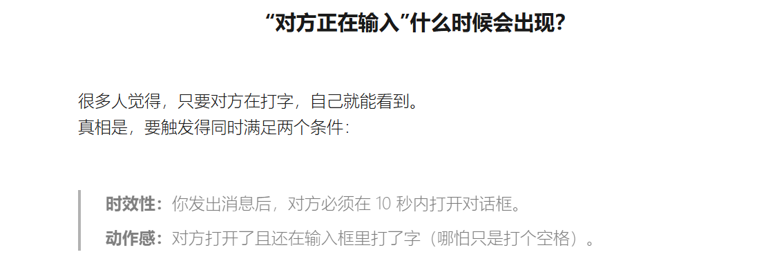 发布的文章中还解读了“对方正在输入”的触发条件:需同时满足用户发消息后,对方10秒内打开对话框,且在输入框内有打字动作(包含空格)。