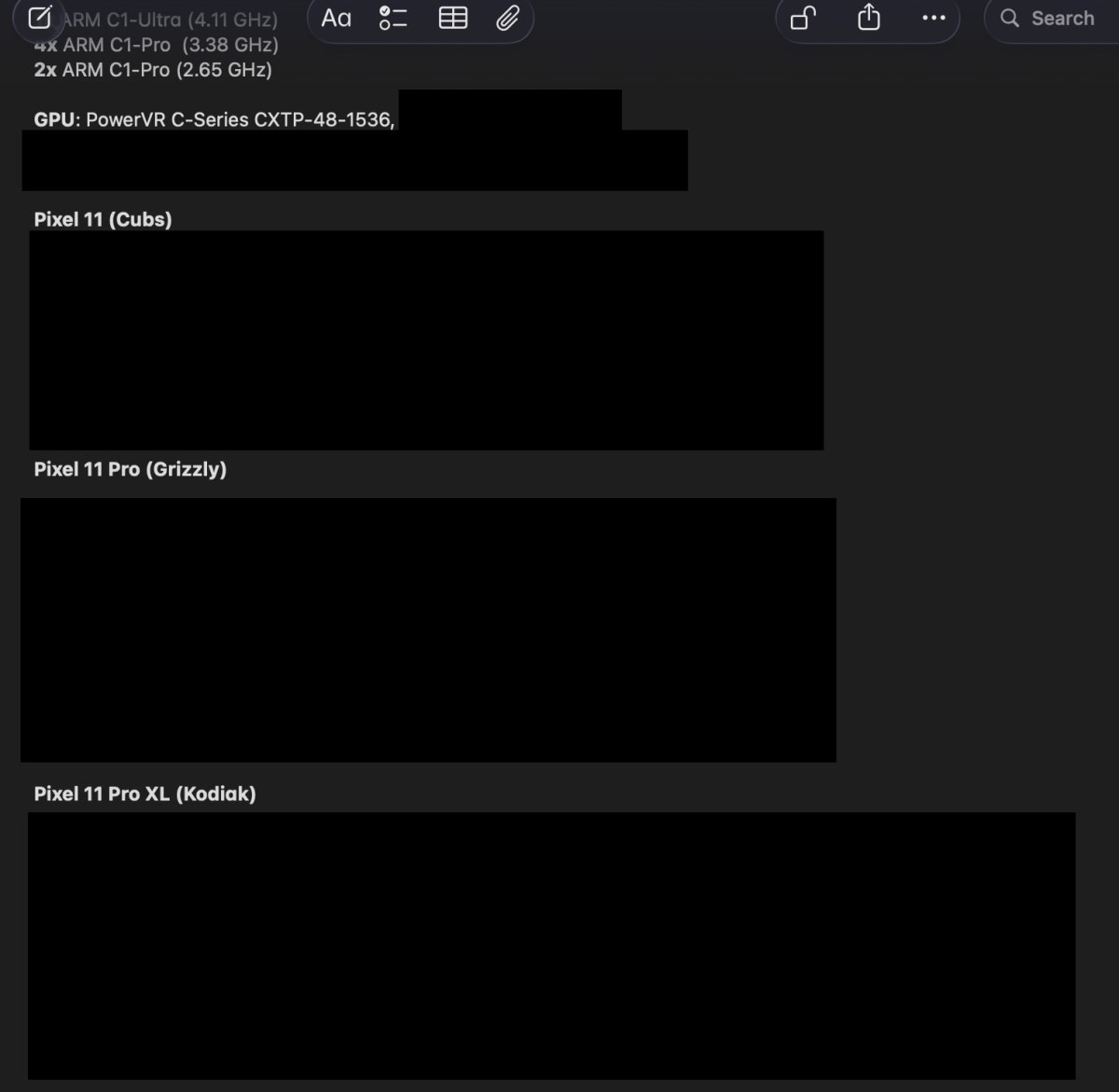 不过,在图形部分,这次的爆料并非全是利好。 爆料信息称,Tensor G6 将采用 PowerVR C-Series CXTP-48-1536 GPU,这是一款已经问世数年的图形核心。 尽管Google有可能会使用经过更新或定制的版本,但从目前的线索来看,Pixel 11 系列在游戏性能方面大概率不会主打“游戏神机”这一卖点。