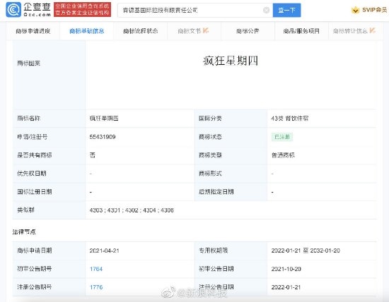 企查查app显示,肯德基已于2022年1月21日成功注册疯狂星期四商标,国际分类为43类餐饮住宿。疯狂星期四为肯德基每周四活动,后被网友进行二次创作,例如在星期四这天扮演多种身份,但最终还是回到请客“疯狂星期四”的话题。