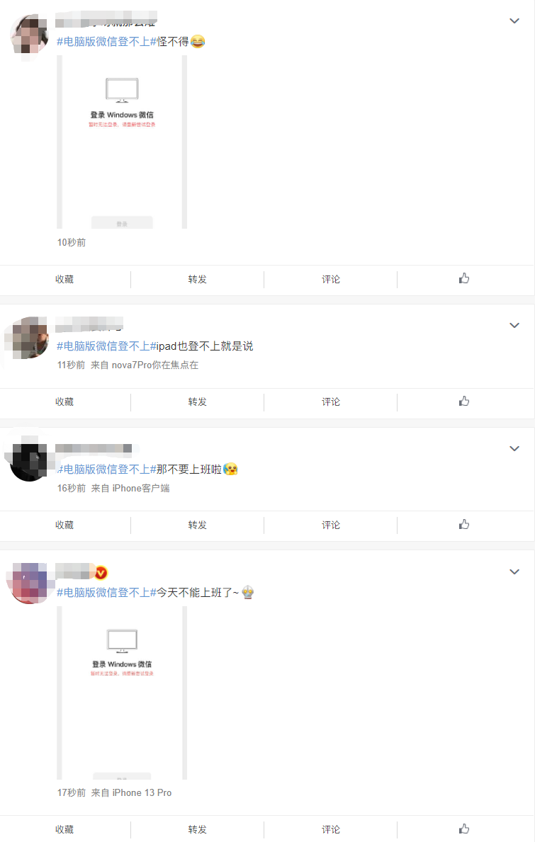 3月29日一大早,有大量用户在微博上发文称自己的微信崩了,该话题也冲上了微博热搜的前五。从网友的反馈来看,基本都是电脑版微信登不上的问题,另外还有一些用户表示iPad版本的微信同样登不上。