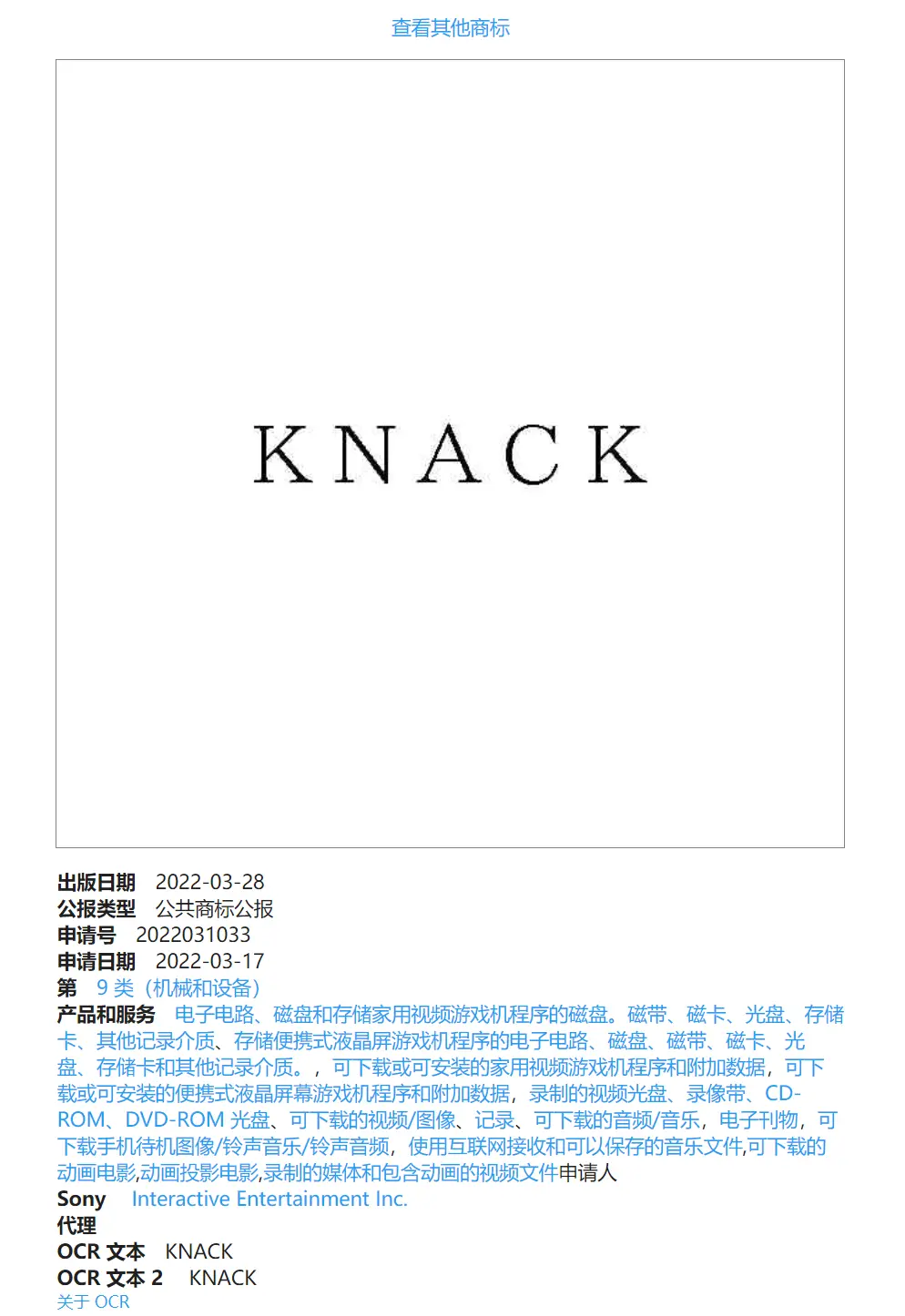 今天有爆料称,索尼可能很快将会公布一些重磅消息。而现在有网友发现了一个索尼新注册的游戏商标,或许它就是这次的重大消息之一!据悉,索尼在3月17号在日本地区申请注册了“Knack(纳克)”商标,而这个商标在今天(3月28日)正式对外公开。