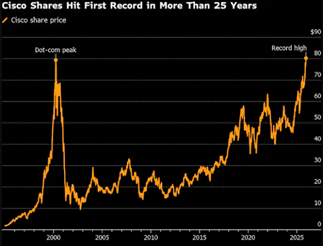 部分得益于人工智能的支出热潮,昔日互联网泡沫时期“纳斯达克四骑士”之一的思科系统股价,终于焕发了第二春——时隔25年再度创下新高。思科股价周三收盘上涨0.9%至80.25美元,突破了之前维持了逾25年的历史峰值水平。该公司2000年3月27日创造的股价高点曾被业内普遍视为互联网泡沫顶峰。以科技股为主的纳斯达克100指数,也直到2015年末才超越了互联网泡沫时期的的前历史峰值水平。