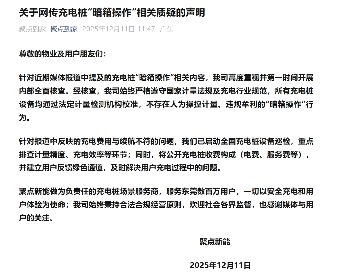 此事引起网友关注热议,12月11日,聚点新能发布情况说明:针对近期媒体报道中提及的充电桩“暗箱操作”相关内容,我司高度重视并第一时间开展内部全面核查。