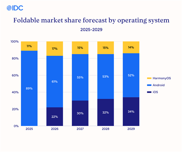 目前业内对苹果折叠屏的市场非常看好,上周IDC最新发布的预测显示,苹果明年强势入局,将直接以22%的份额跻身全球折叠屏前三,超越布局多年的华为。