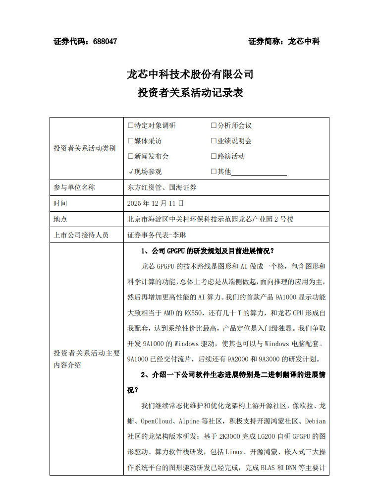 今日,龙芯中科发布投资者关系活动记录表,介绍公司GPGPU的研发规划及进展。龙芯中科表示,9A1000已经交付流片,后续还有9A2000和9A3000的研发计划。