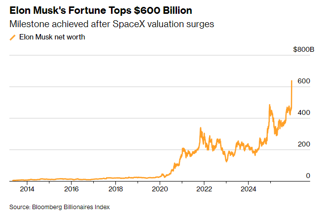 随着SpaceX获得新一轮估值提升,埃隆·马斯克的个人财富再创新高,首次突破6000亿美元。彭博亿万富豪指数显示,这位全球首富目前身家接近6380亿美元。此前,SpaceX在一轮内部股票交易中估值达到约8000亿美元,使这家总部位于得州斯塔贝斯的火箭制造商成为全球最具价值的私营企业。马斯克是该公司的创始人兼首席执行官。
