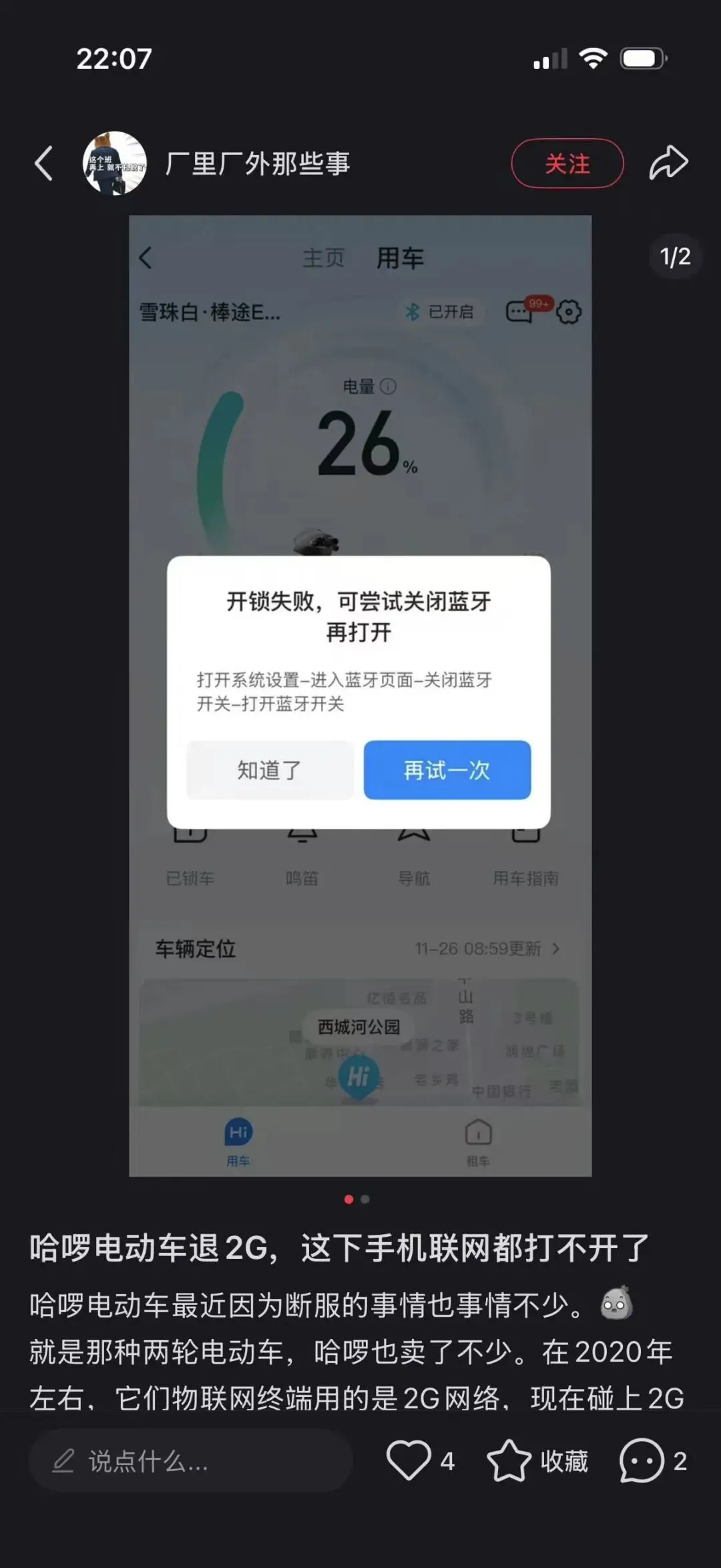 2025 年 12 月,多名用户表示自己的哈啰电动车出现“断网”情况,原本可以通过 App 远程查看电量、定位车辆的功能突然消失,部分用户甚至在社交平台上表达了对安全问题的担忧。哈啰电动车随后也给出回应,称问题源于运营商 2G 网络退网。
