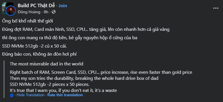 看看熊孩子多能惹祸吧!来自越南的一位网友发帖,自称是“全世界最惨的老爹”,因为在硬盘价格疯涨的当下,他那10岁的儿子却因为好奇贪玩,把一整箱的M.2 SSD给掰断了!