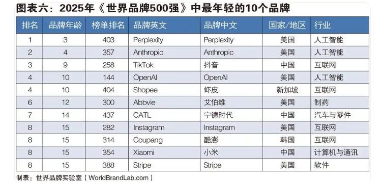 具体到大家熟悉的科技品牌中,腾讯排名第29名、华为在50名、台积电是73位置,而阿里巴巴、联想、茅台、抖音和小米等分列115名、129名、214名、258名和354名。