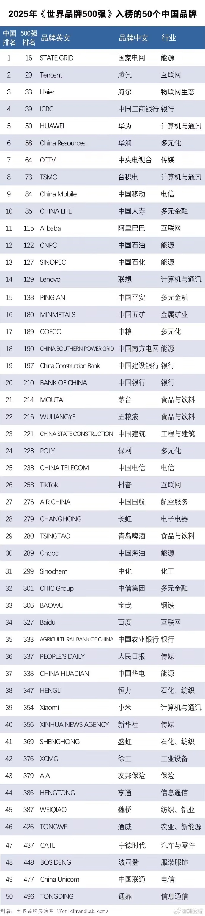 世界品牌实验室(World Brand Lab)推出了2025年全球世界500强,其中谷歌超越苹果位居榜首,微软继续排于第二,苹果则退居第三。从品牌数量的国家分布看,美国以184个品牌入选居首位;法国、中国、日本和英国分别有51、50、40和34个品牌上榜。在入选的中国品牌中,国家电网、腾讯、海尔、华润、中国五矿、中国南方电网、五粮液等排名靠前。