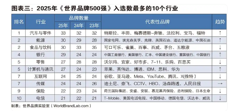 榜单共覆盖50个行业。其中,汽车与零件共有33个品牌上榜,排名第一;能源、食品与饮料各有30个品牌上榜,并列第二;银行有29个品牌上榜,排名第四;零售、计算机与通讯各有27个品牌上榜,并列第五。