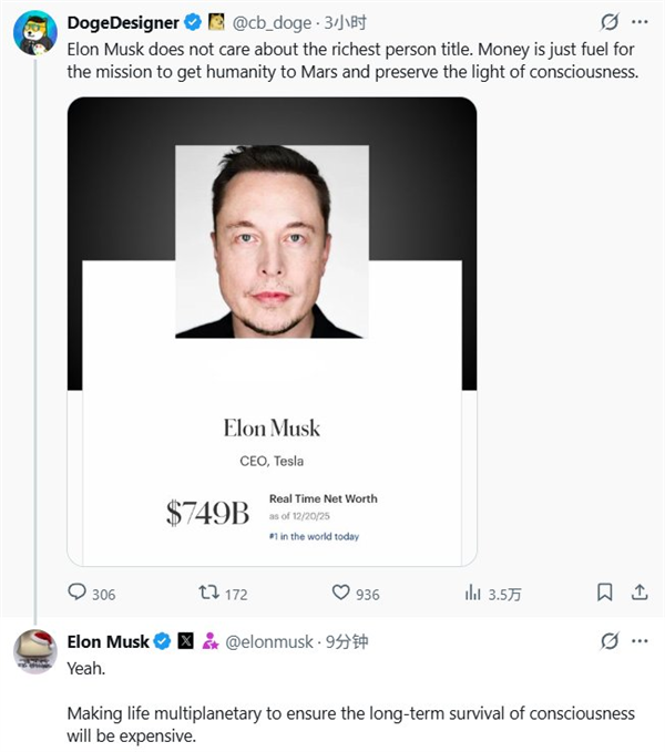 有网友在社交媒体上表示:“埃隆·马斯克并不在意世界首富的称号,财富对他来说只是推动使命的燃料——他的使命是让人类登陆火星,延续文明的火种。”对此,马斯克评论称:“的确如此,要实现生命的多行星生存、保障文明的长久延续,这项事业必将耗资不菲。