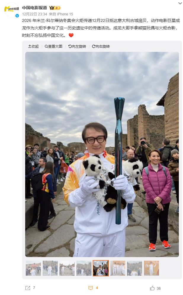 据“中国电影报道”官微消息,日前,2026年米兰-科尔蒂纳冬奥会火炬传递抵达意大利古城庞贝,动作电影巨星成龙作为火炬手参与传递活动。现场照片显示,成龙即兴摆出电影中醉拳的经典架势,尽管年过七旬,但他身手依然矫健。