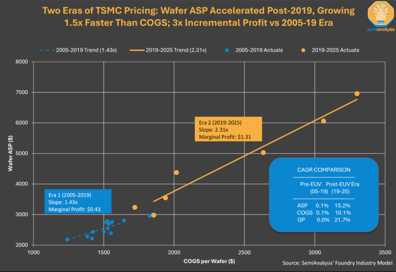 作为全球工艺最先进的晶圆代工厂,台积电是从什么时候起飞的?回头来看,量产EUV工艺是个转折点,此后的几年中台积电业绩及利润直接起飞。半导体分析机构Semi Analysis日前公布了台积电晶圆ASP均价的研究,指出台积电从2005到现在的20年可以分为两个阶段,2005到2019年以及2019到现在的6年。