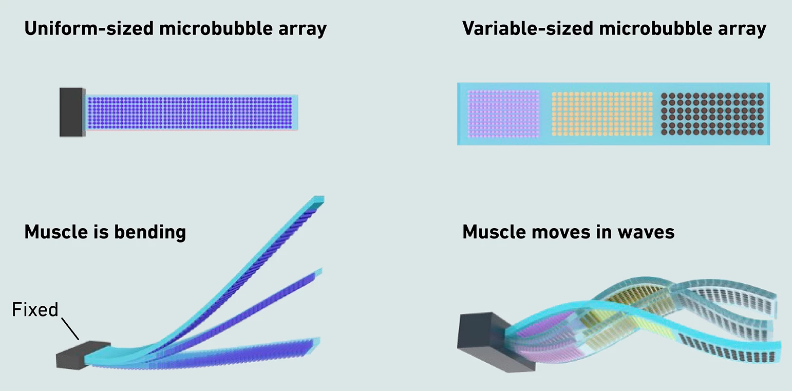 微泡排列方式决定了“肌肉”的运动形式:当薄膜上气泡大小统一时,整体主要根据超声信号的振幅发生弯曲;当气泡大小不一时,不同尺寸气泡对不同频率的超声产生选择性响应,从而在薄膜上形成连续的波浪式传播,实现类似鱼类游动的起伏运动。正是这种可编程的弯曲与波动组合,使得黄貂鱼机器人在水中展现出逼真的仿生游姿。