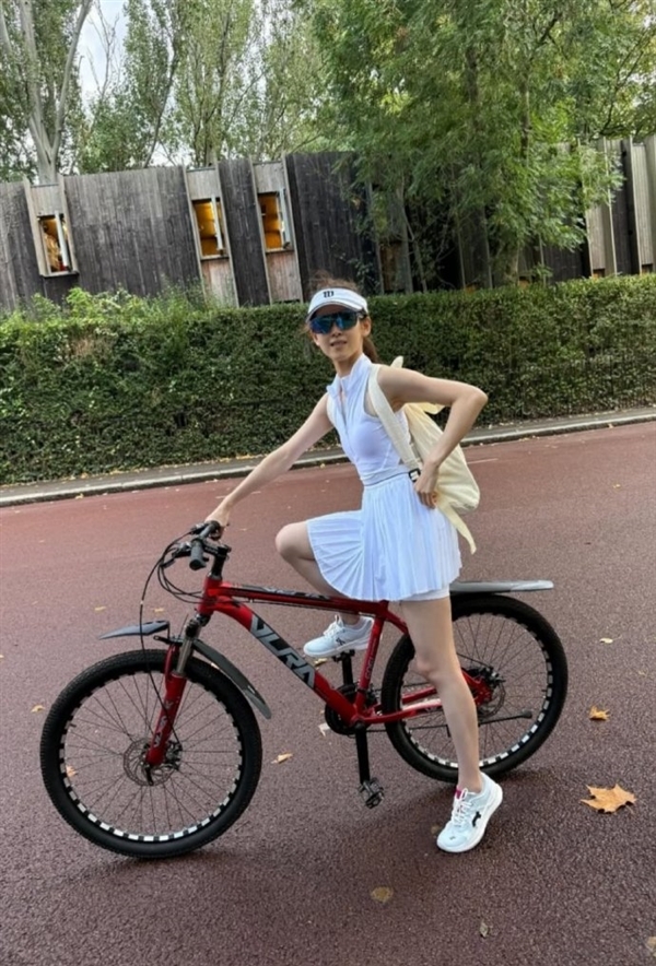今年9月初,章泽天曾晒过一次网球照,当时她穿白色网球裙骑红色单车。