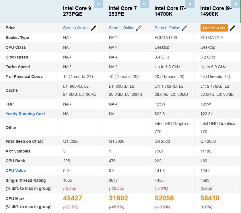 Intel Bartlett Lake纯P核旗舰处理器Core 9 273PQE近日现身PassMark数据库,其多核性能在核心数减半的情况下,与i9-14900K相差并没有想象的大。这款型号为酷睿9 273PQE的处理器仅拥有12个大核(12核24线程),完全舍弃了能效核。