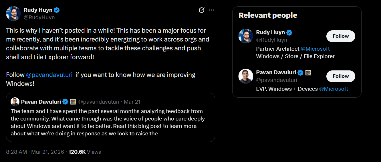 此次发布的官方博文《我们对 Windows 质量的承诺》(Our commitment to Windows quality),更像是一份针对用户痛点的“施工路线图”,逐条回应长期存在的问题。从社交平台上的反馈来看,多位微软高管和工程师已经主动参与讨论,评论区罕见地开始出现明显向微软“偏转”的声音。