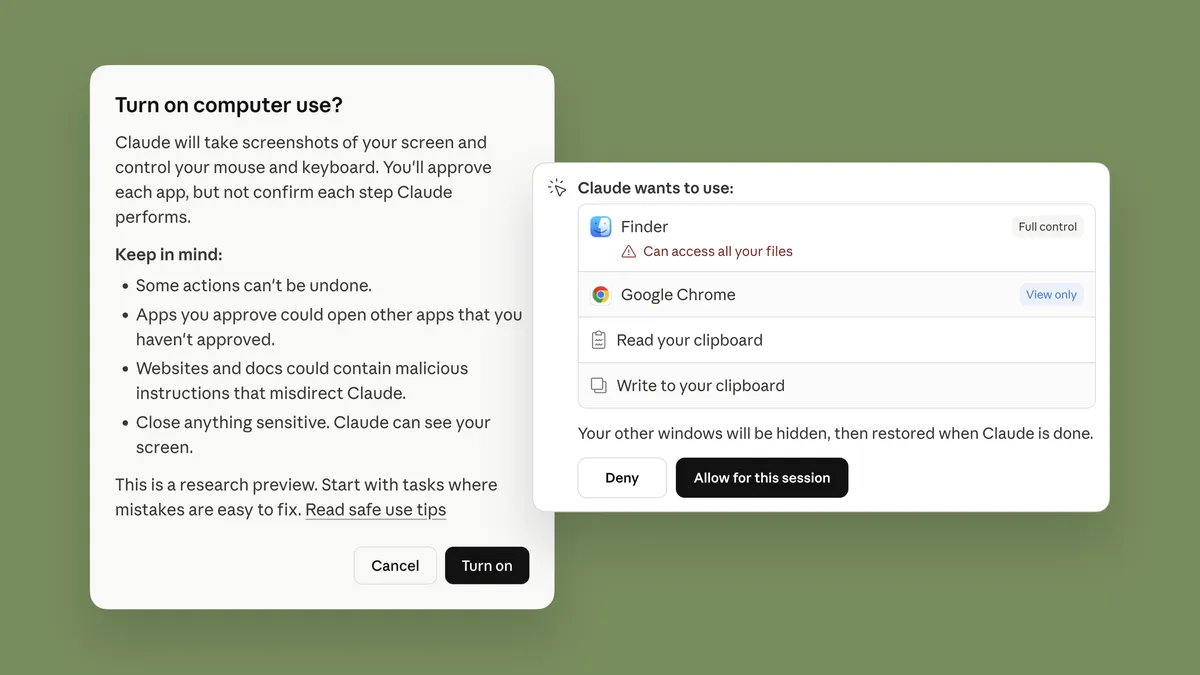 Anthropic 表示,Claude 在接到任务后会优先通过与各类应用的“连接器”寻找合适工具,例如整合 Google 日历或 Slack 等服务。 若相关工具或连接器不可用,Claude 也可以直接模拟用户操作,通过键盘输入与鼠标移动来执行任务,包括使用浏览器、开发工具以及打开本地文件等。 在执行过程中,Claude 会像普通用户一样进行滚动、点击等操作,但每一次实际操控前都需获得用户许可,且用户可以在任何时间中止 Claude 的行为。