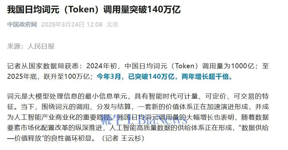 Token的中文名,看起来终于定了!今天,中国政府网转发人民日报援引自国家数据局的文章显示,我们日均词元调用量突破140万亿。140万亿的数据量很夸张,但这条新闻背后的Token中文命名更有意思,似乎可以平息最近业界对于Token中文名的争议。