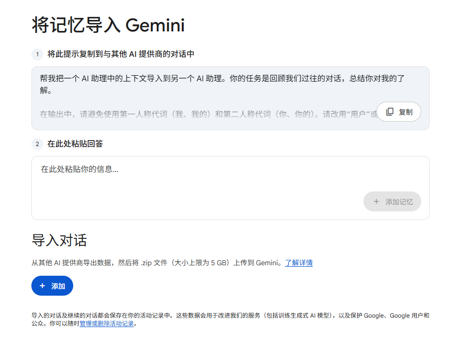 第一种是提示词复制迁移,用户只需复制指定提示词到原AI对话中,让其总结对自己的了解,再将生成内容粘贴回Gemini,即可完成偏好、习惯等信息的同步。