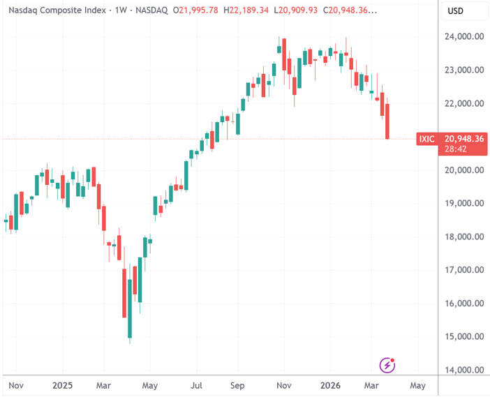 随着2月28日点燃的中东战火持续燃烧了一整个月,美股市场也出现了加速下跌的迹象,特别是曾经光芒万丈的科技巨头。截至周五收盘,纳斯达克指数本周累计下跌3.23%,创去年4月“关税冲击”以来最大单周跌幅