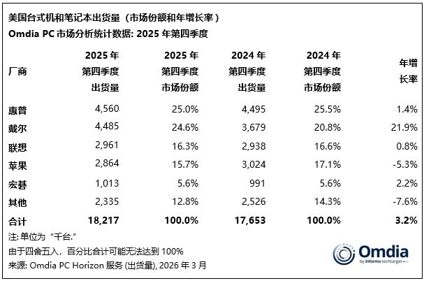 Omdia最新研究显示,2025年第四季度,美国PC出货量(不含平板)同比增长3%,达到1820万台,扭转了此前连续两个季度的同比下滑。这一增长主要得益于Windows 11商用换机周期进入高峰,节日季需求以及厂商在预计2026年内存和存储供应趋紧前提前备货等多重因素推动。