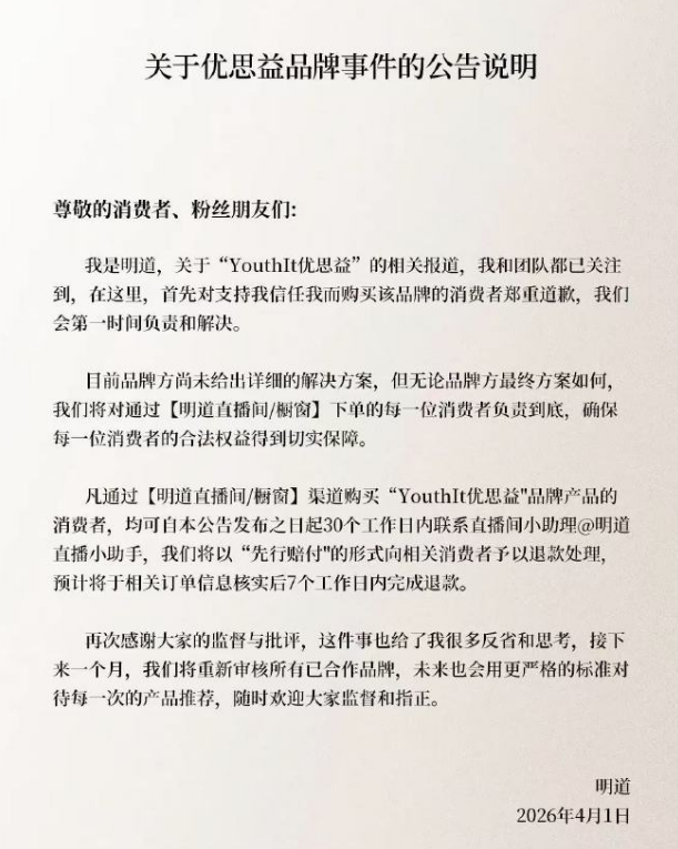 明道宣布,30个工作日内登记订单,核实后7日内完成退款,针对直播间购买用户提供先行赔付。