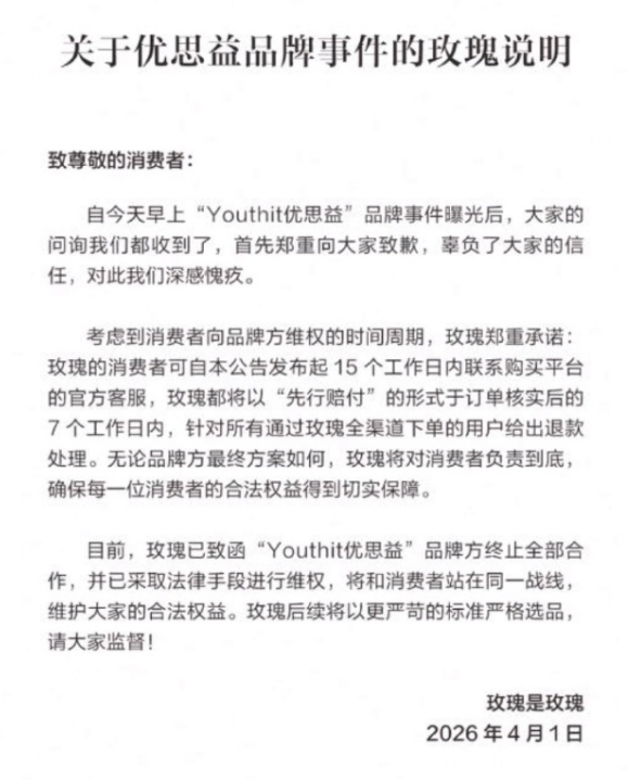 章小蕙通过“玫瑰是玫瑰”账号承诺,自公告起15个工作日内联系客服,以先行赔付形式在7个工作日内退款,覆盖全渠道下单用户。