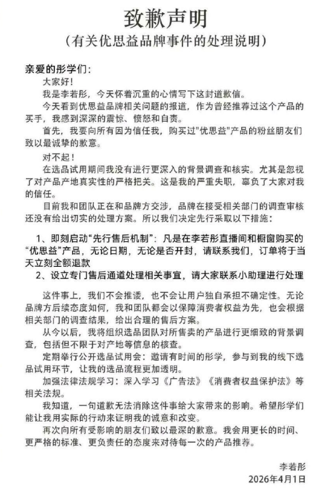 李若彤在公众号表示,即刻启动全额退款机制,无论购买日期或是否开封,消费者联系客服即可当天处理,并设立专属售后通道。
