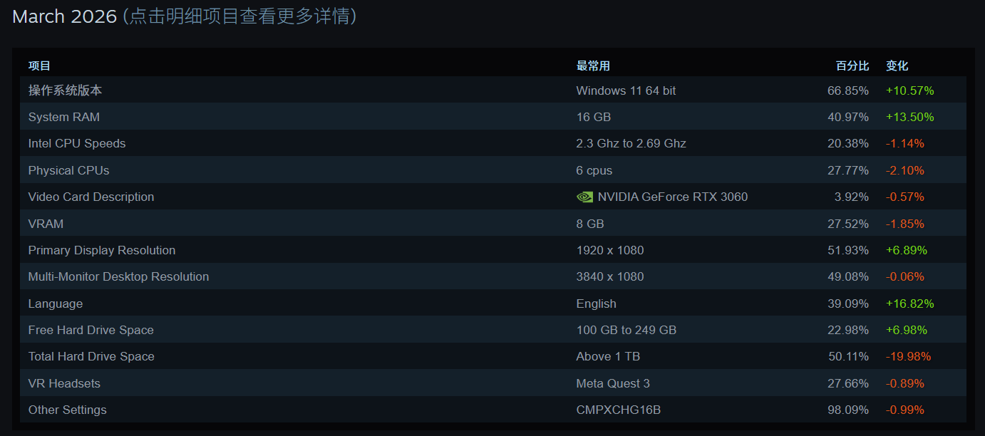 Steam 3月硬件调查:16GB反超32GB登顶、Linux份额历史性首破5%