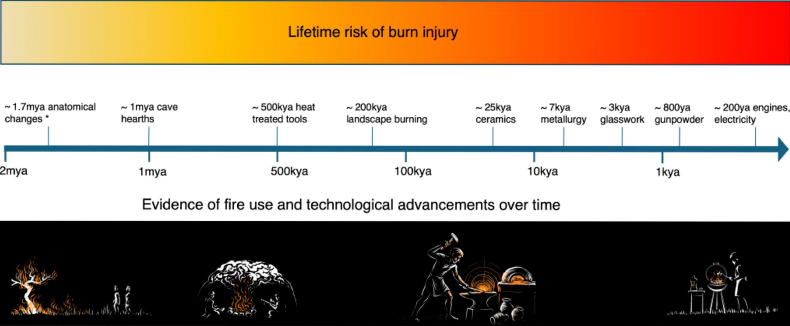 火的控制与利用,是人类进化过程中的关键里程碑之一。自至少一百万年前开始,人类及其祖先就将火带入日常:用来烹饪、取暖、驱兽,直至推动冶炼、工业和现代技术的发展。与大多数本能避火的动物不同,人类长期、近距离地在火源旁生活和劳动,使得大小烧伤在群体中频繁发生,并代代相传地构成稳定的环境风险。