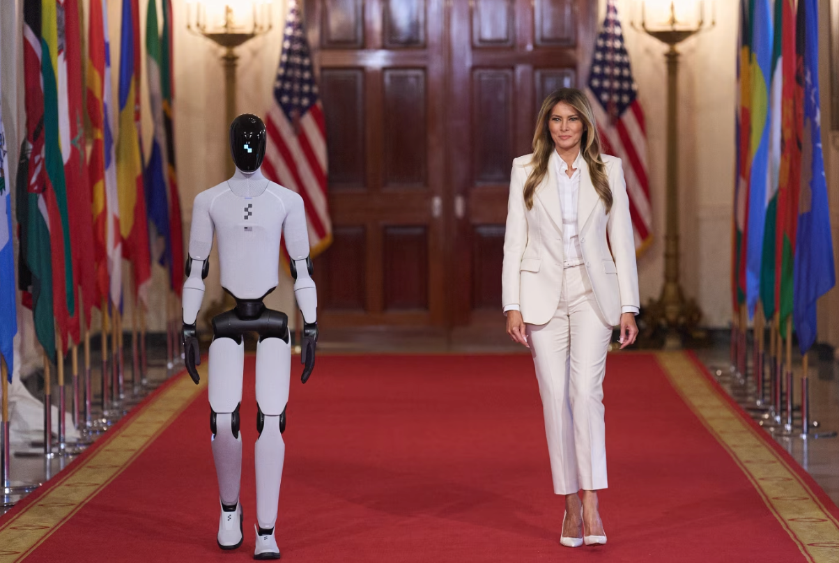 今年3月,美国第一夫人梅拉尼娅在白宫主持的一场教育峰会上,与硅谷公司Figure AI开发的最新人形机器人并肩走过。机器人对观众说:“我是Figure 03,一款在美国制造的人形机器人。”