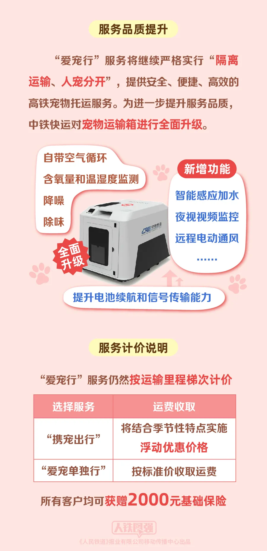 “爱宠行”服务仍然按运输里程梯次计价,选择“携宠出行”服务将结合季节性特点实施浮动优惠价格,选择“爱宠单独行”的客户按标准价收取运费,所有客户均可获赠2000元基础保险。