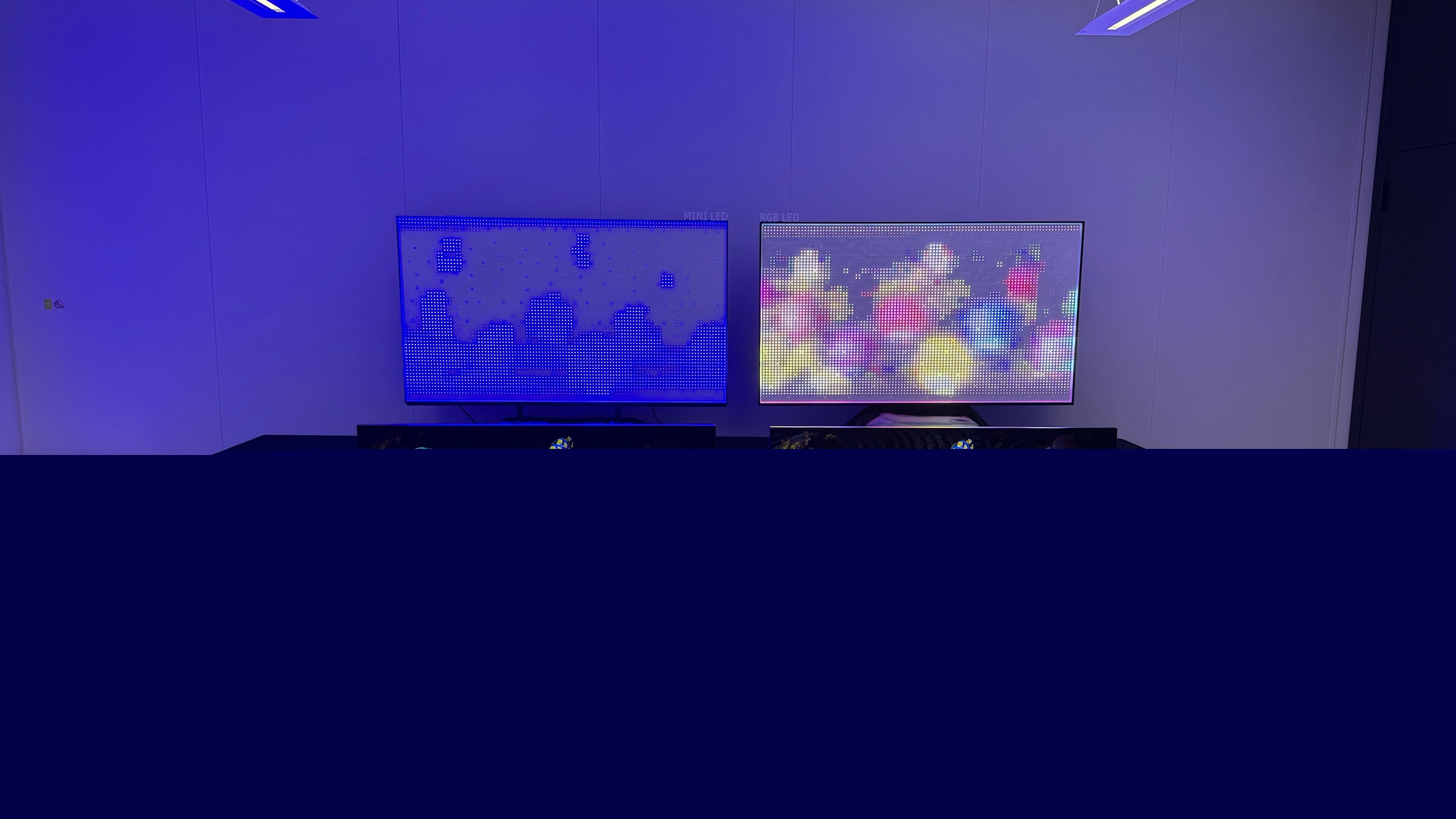 闭门演示环节展示了两台样机,一台是索尼75寸Bavia 9电视,另一台是75寸True RGB电视,上方则摆出对应的背光结构: