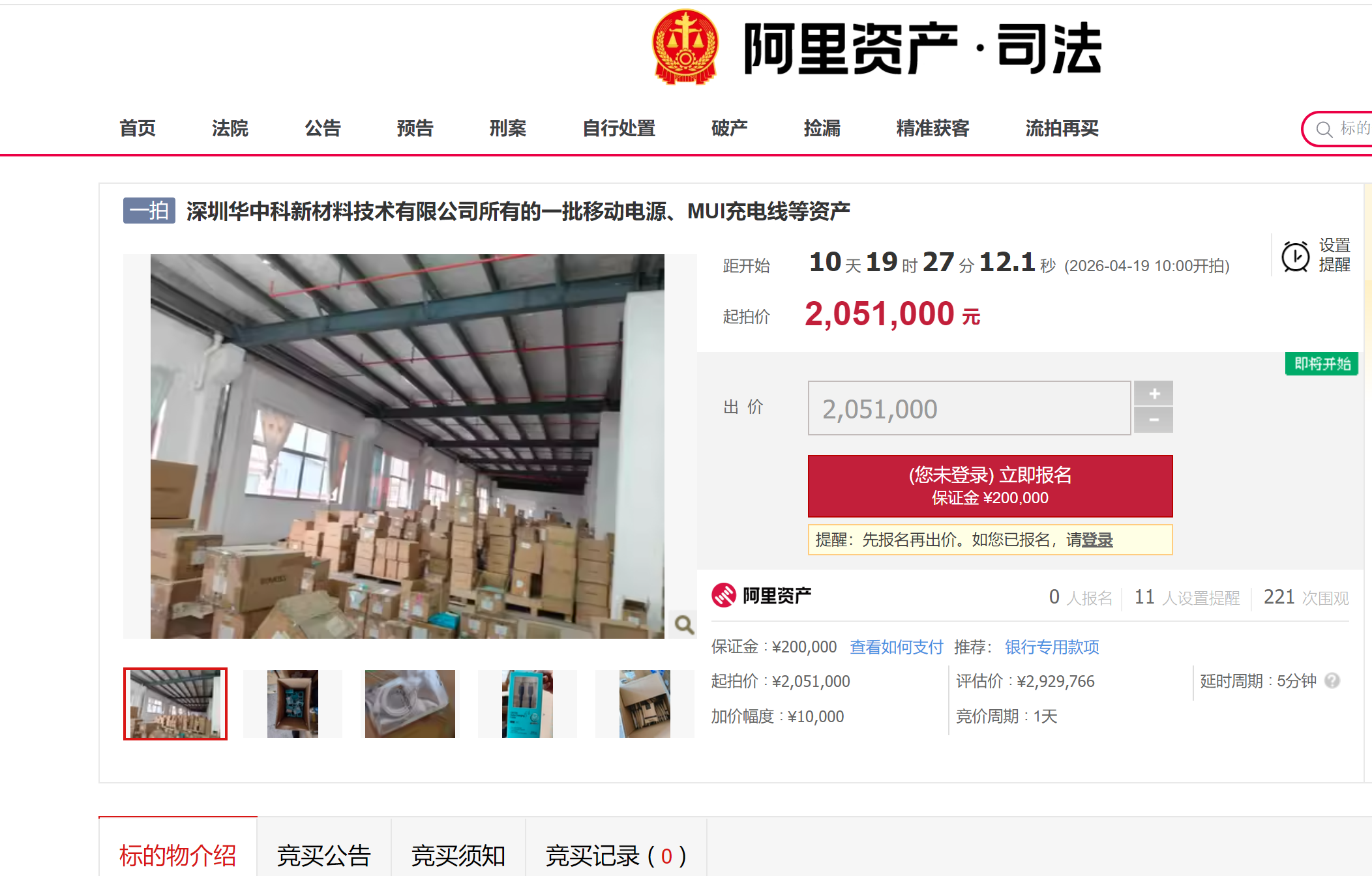 近日,一批积压在仓库里的罗马仕充电宝和充电线,正被法院“摆上货架”。阿里资产司法拍卖平台显示,深圳华中科新材料技术有限公司名下的一批充电宝、充电线等资产,将于4月19日开拍,起拍价205.1万元。
