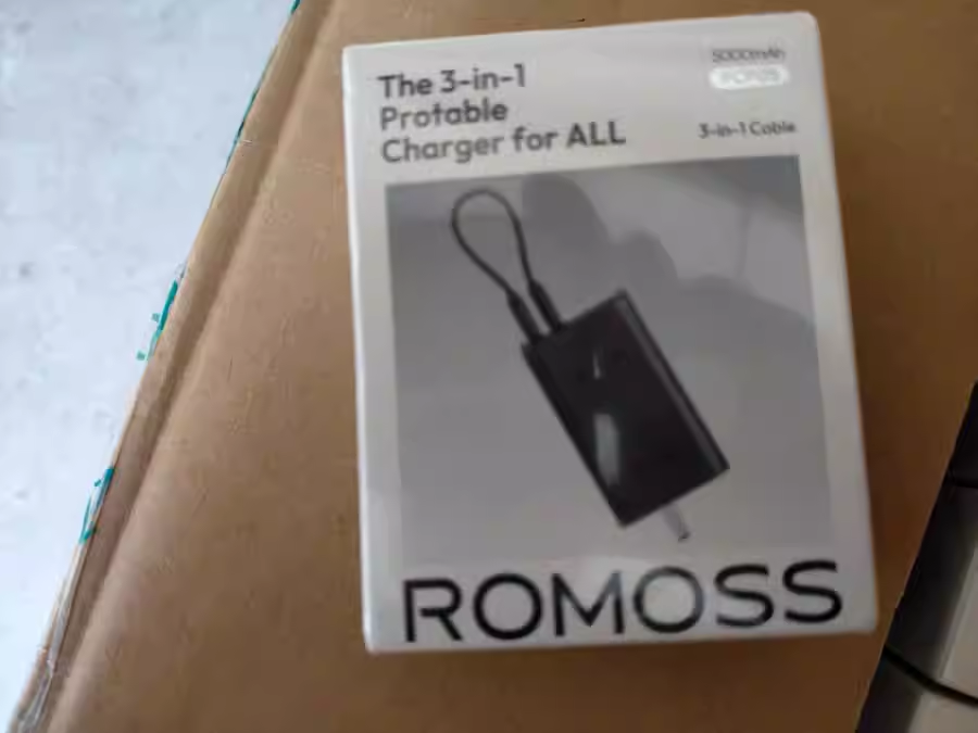 此外还有车载充电器、小风扇、磁吸环等物品,从拍卖平台公布的图片来看,充电宝和充电线的外包装上印有“罗马仕”的字样。