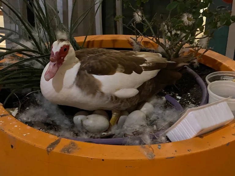而这只鸭子在当地一家意大利餐厅外的花盆里筑巢,是当地有名的“网红”。