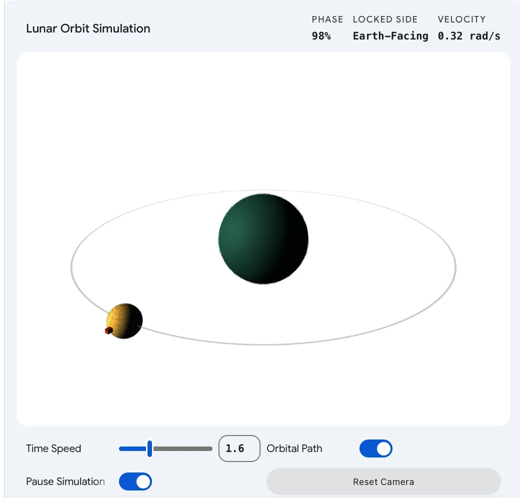 记者在实际体验中,以“生成一个月球绕地球公转的模拟”为例进行测试。Gemini 随即生成了一个可视化的三维场景:用户可以通过滑块调节月球公转速度、通过开关隐藏或显示表示轨道的轨迹线,并使用按钮暂停或继续演示。同时,用户还可以对整套三维模型进行缩放和旋转,从不同视角观察这一运动过程。