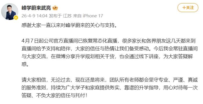 此外,@峰学蔚来武亮 4月9日发文回应公司官方直播间复播表示:“无论过去、现在还是将来,团队会持续为广大学子和家庭提供务实、靠谱的升学指导。”