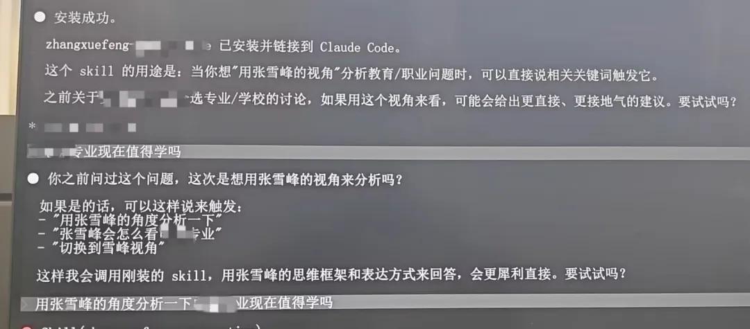 4月9日,记者实测发现,“张雪峰.skill”存在一定的安装门槛,在专业人士协助下才成功使用。页面显示,该技能已成功安装并链接到Claude Code。当用户希望用张雪峰的视角分析教育、职业问题时,可以直接通过关键词触发,AI可能会给出更直接、更接地气的建议。