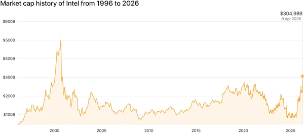 最近,Intel股价爆了。利好消息有不少,但份量最重的,莫过于抱上了马斯克TERAFAB项目的大腿。昨日美股收盘,Intel市值定格在3098.97亿美元。这是互联网泡沫破裂后,25年多来的最高纪录。